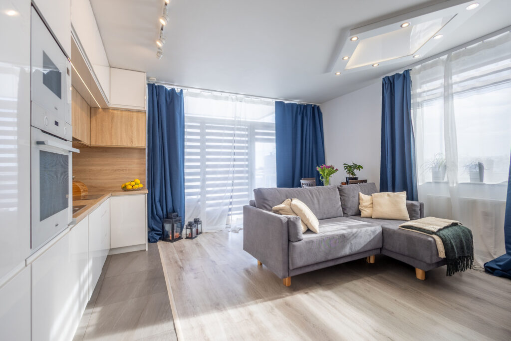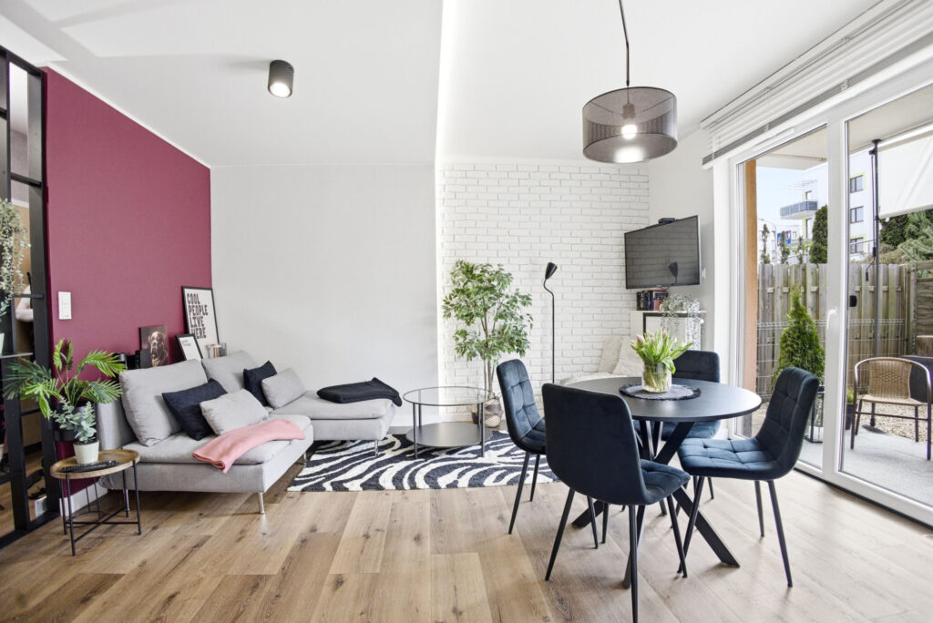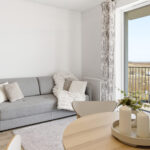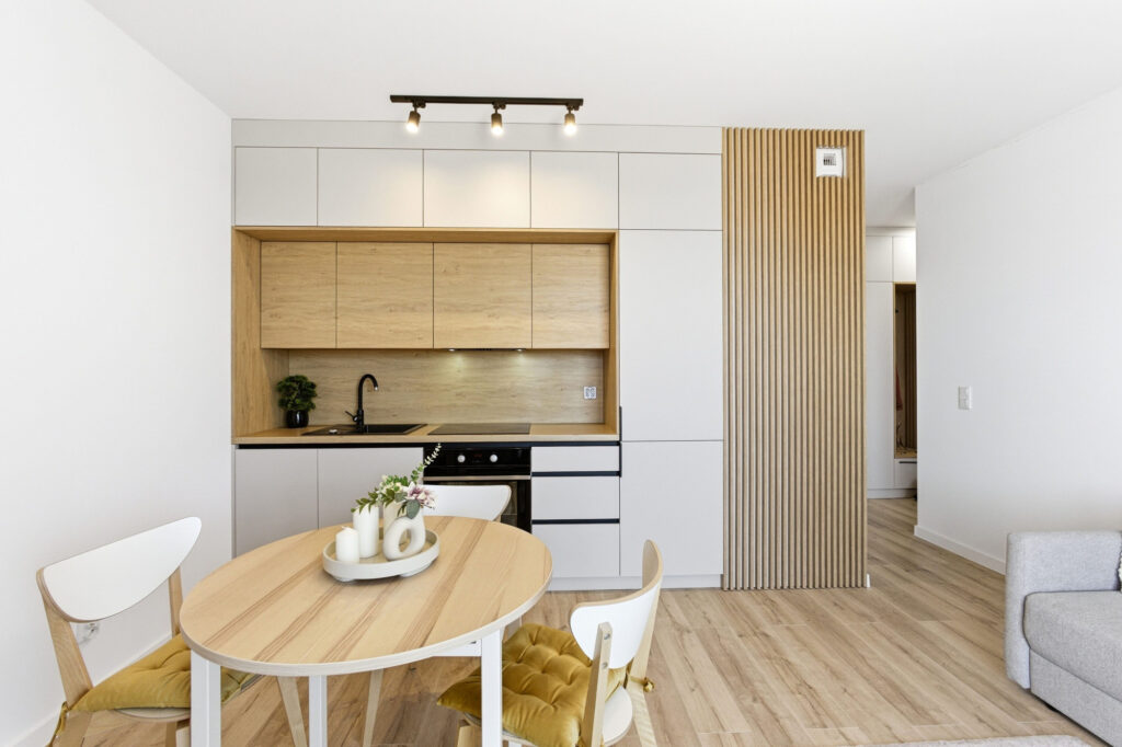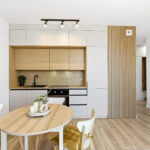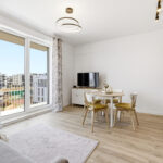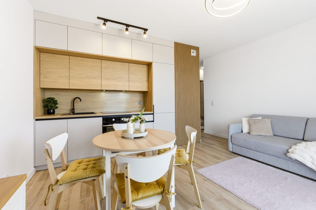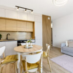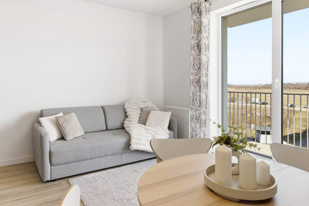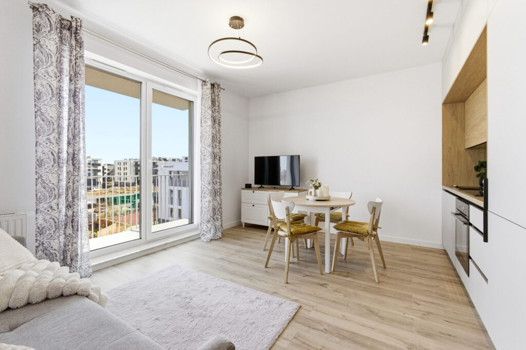 Centralną część mieszkania stanowi jasny salon z aneksem kuchennym i częścią jadalnianą. Przestrzeń została zaprojektowana tak, aby zapewnić maksymalną wygodę użytkowania, a jednocześnie zachować estetyczną spójność.