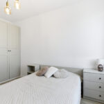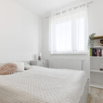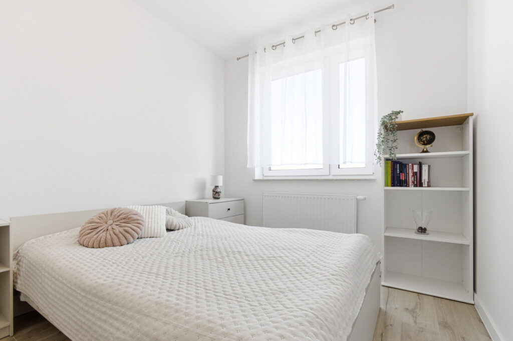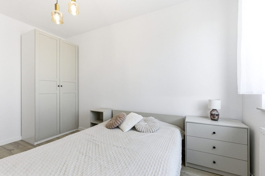 Sypialnia została zaprojektowana jako spokojna i przytulna przestrzeń sprzyjająca relaksowi. Znajduje się w niej wygodne łóżko, stoliki nocne oraz miejsce do przechowywania. Jasna kolorystyka i naturalne światło sprawiają, że pomieszczenie jest bardzo przyjemne i harmonijne.