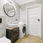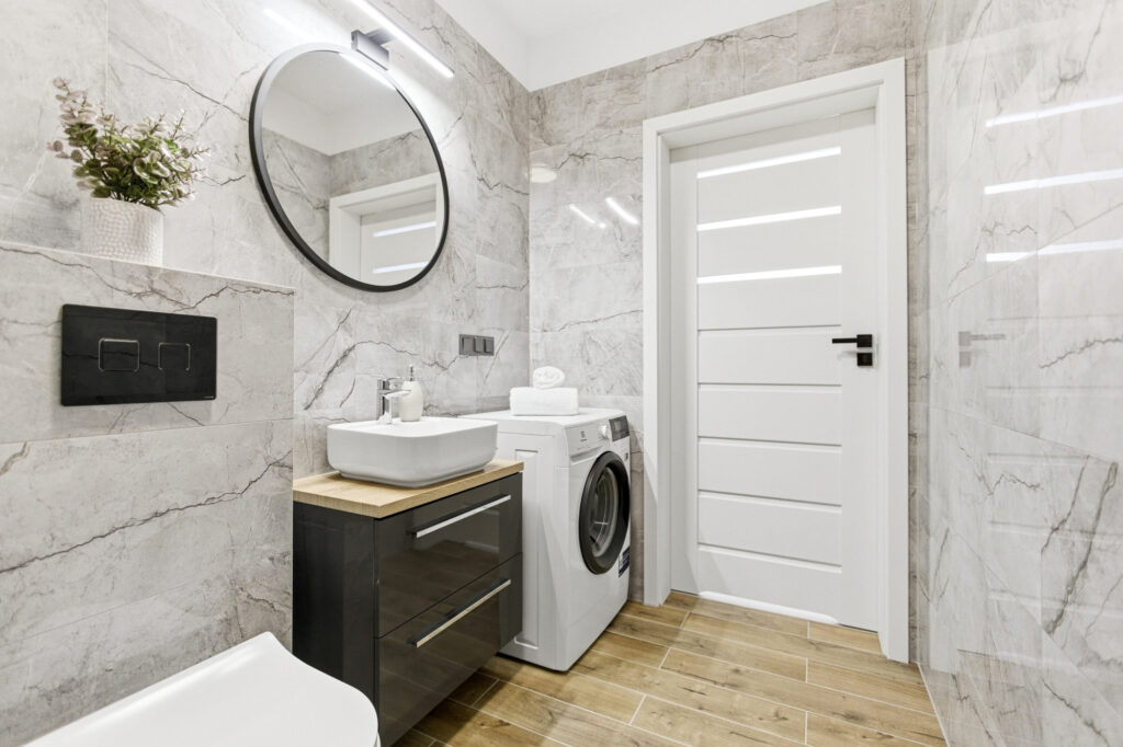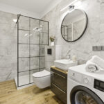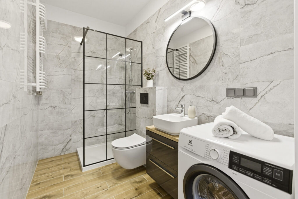 Łazienka została wykończona w eleganckim, nowoczesnym stylu. Znajduje się tu przestronna kabina prysznicowa typu walk-in z modnymi czarnymi profilami, stylowa umywalka z szafką oraz pralka.