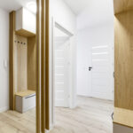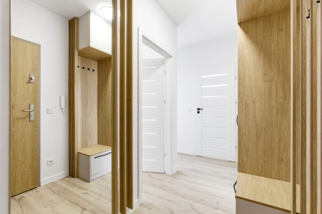 Przedpokój został zaprojektowany z myślą o maksymalnej funkcjonalności. Znajduje się w nim pojemna zabudowa meblowa zapewniająca dużo miejsca do przechowywania. Całość została wzbogacona o elegancką ścianę dekoracyjną z pionowych drewnianych lameli, która nadaje wnętrzu nowoczesnego i prestiżowego charakteru.