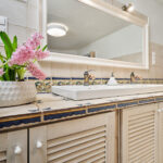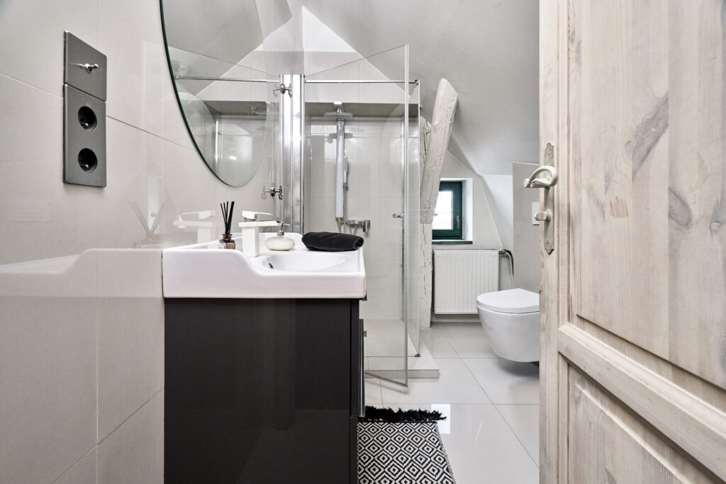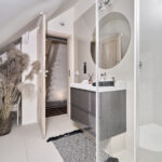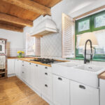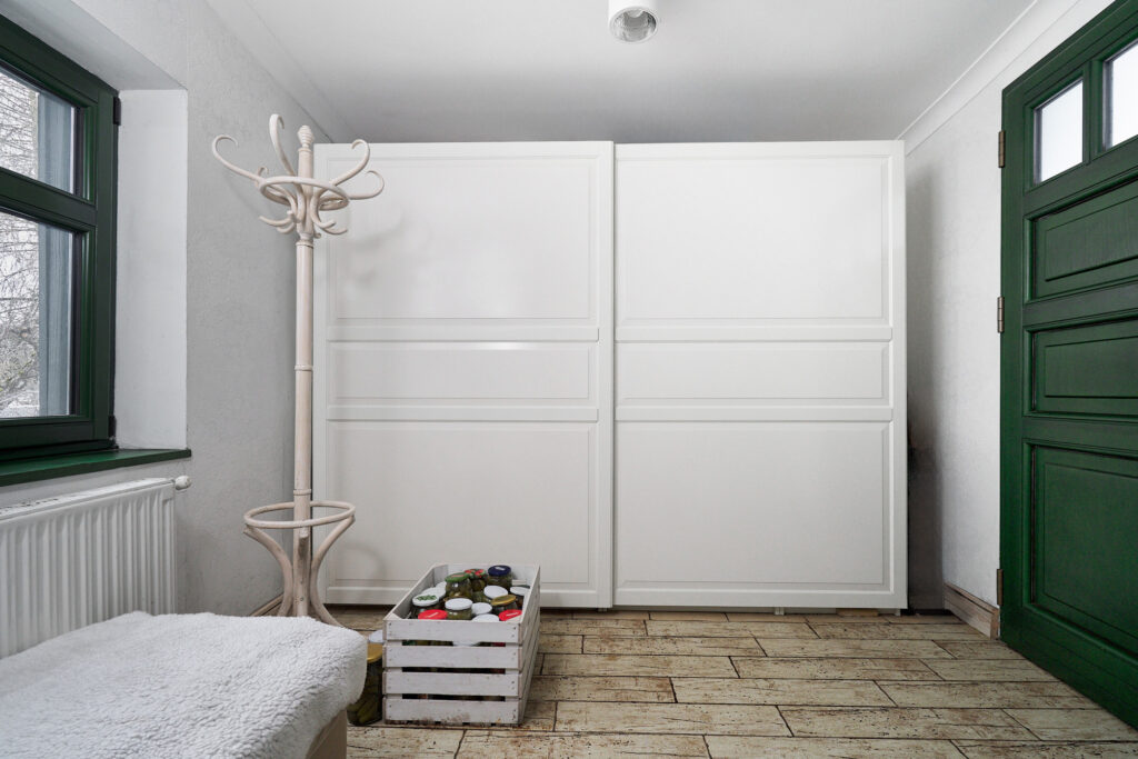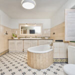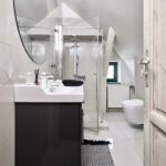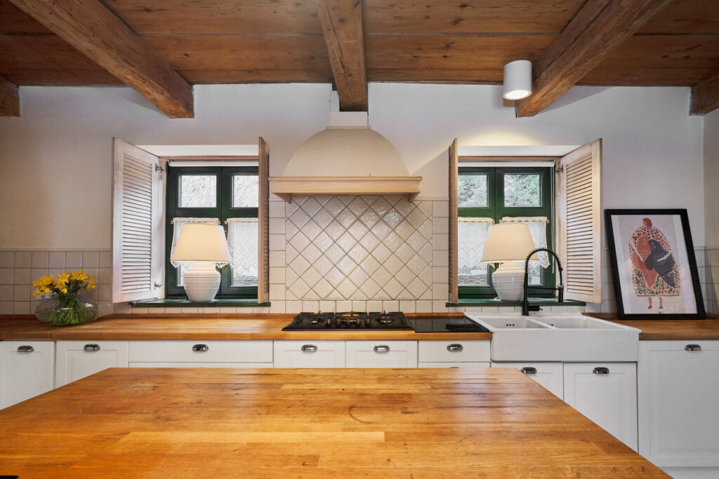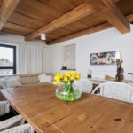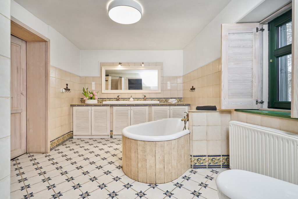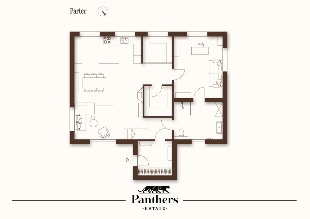 Przestronny salon z wyjściem na taras i kominkiem ciepło zapraszają do otwartej kuchni z jadalnią, która została zaprojektowana z wyjątkową starannością o detale. Zaraz obok mamy dostęp do oddzielnej przestrzeni, która może być wykorzystana jako spiżarnia a w jej podłodze ukrywa się piwniczka o pow. ok 20m². Komfortowa sypialnia ma prywatne wejście do zachwycającej łazienki, w której znajdziemy wolnostojącą wannę, zamurowaną kabinę prysznicową, toaletę oraz dwie umywalki. W samym sercu parteru dyskretnie schowane jest małe pomieszczenie gospodarcze. Główne wejście do domu prowadzi przez zamknięty przedpokój z widokiem na ogród.